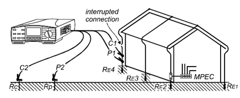 (b) 斷開待測的接地電極,使用4線2探頭的方法測量